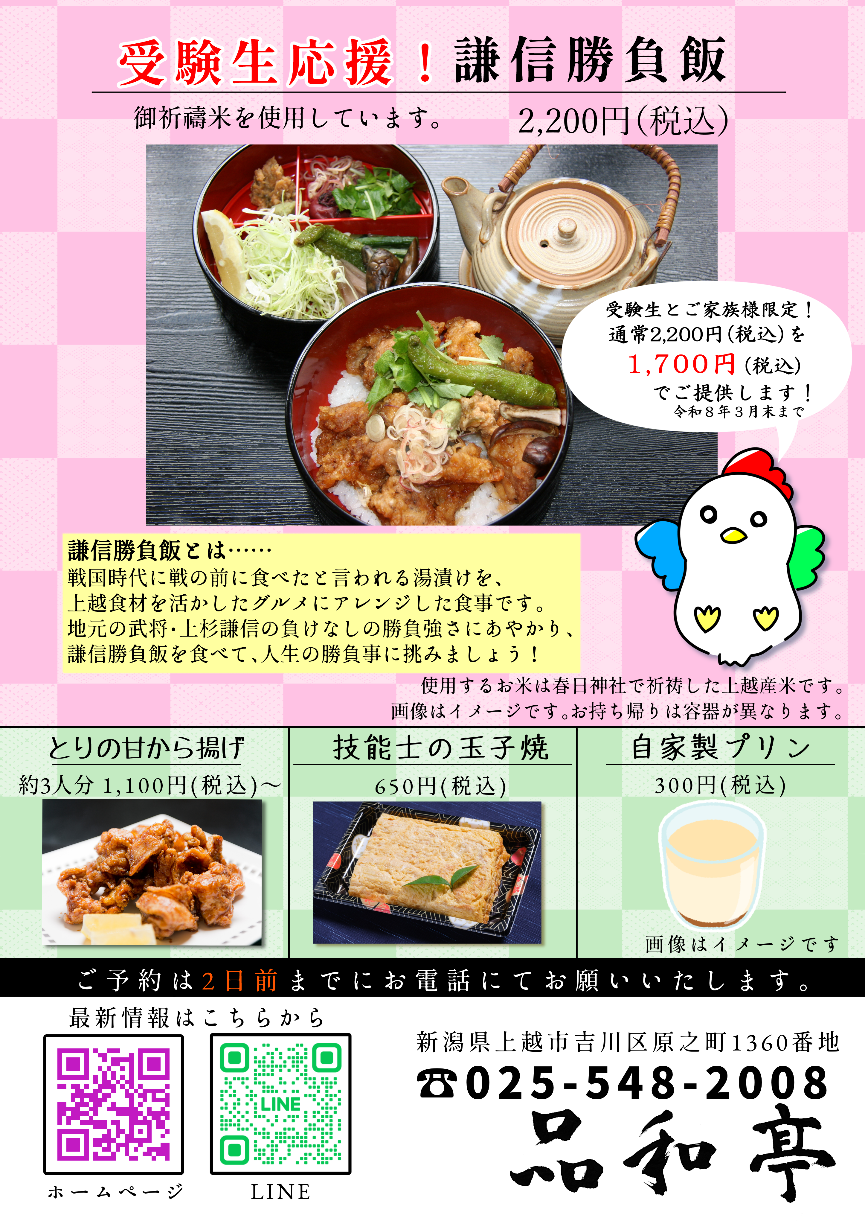 謙信勝負飯自体は通年でご予約いただけるお料理ですが、3月末までの受験シーズンでは、