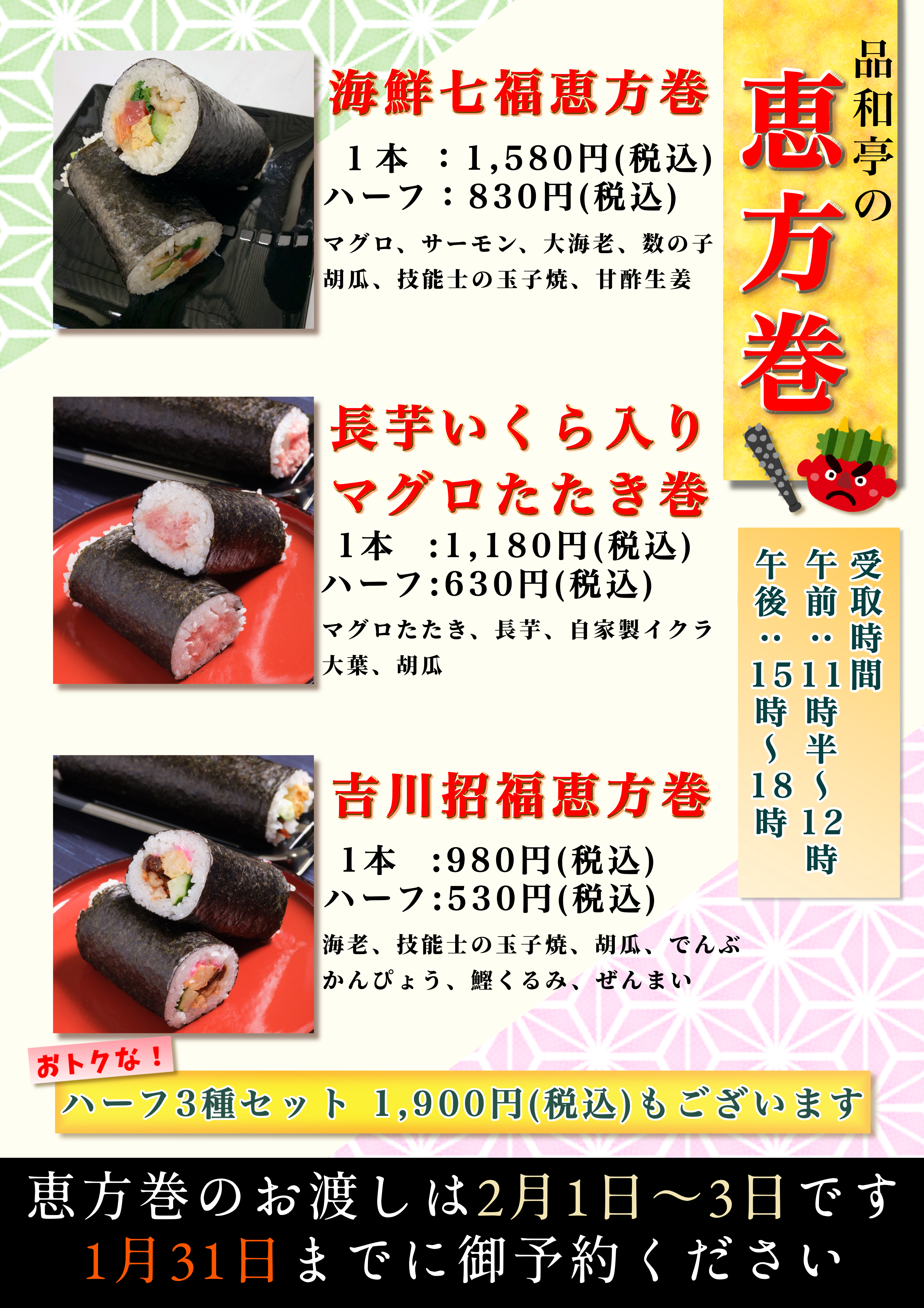 恵方巻の予約は1月31日までとなっております。